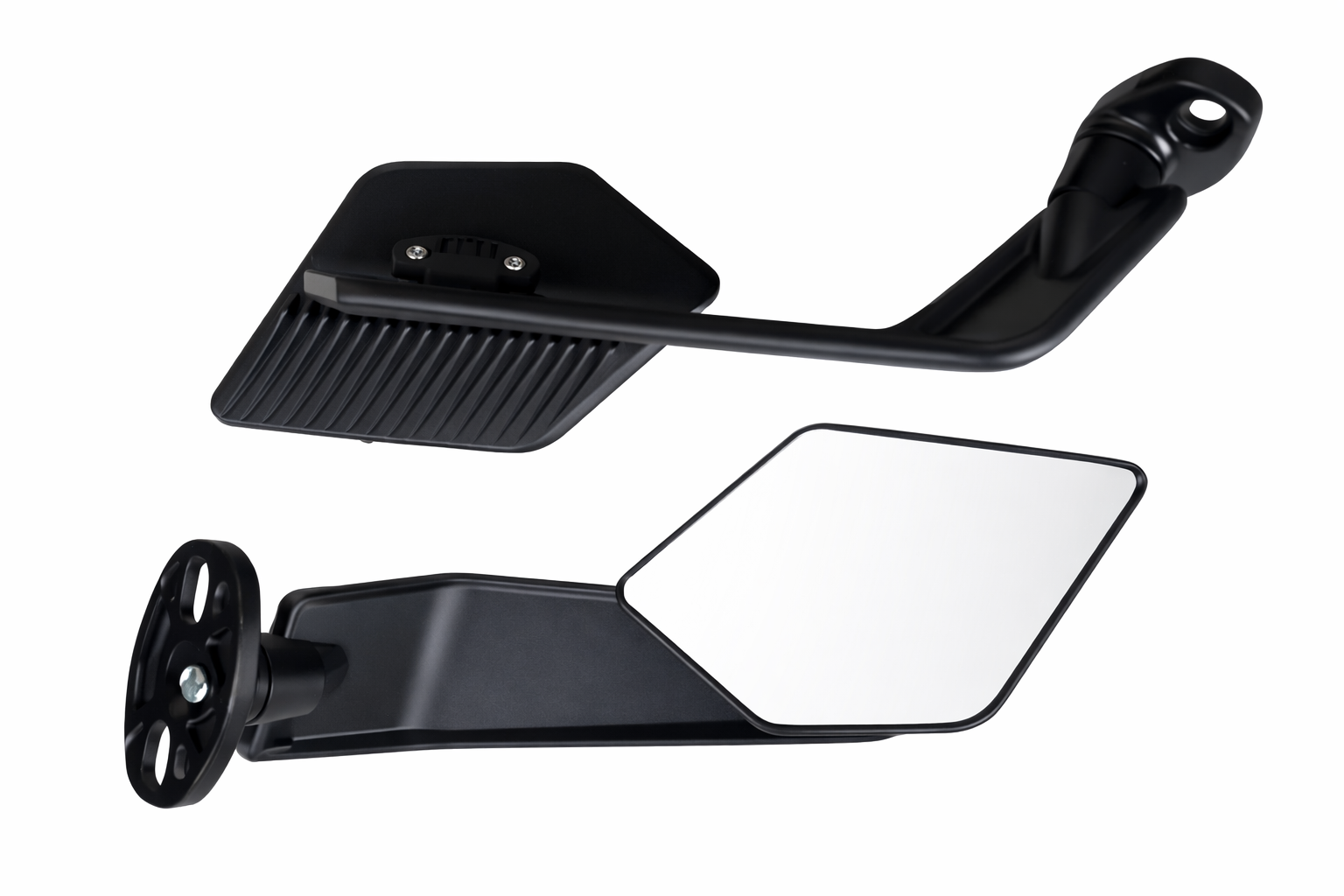 Detalles: Diseño angular tipo deportivo con brazo rígido para mayor estabilidad. Superficie amplia que mejora el campo de visión.