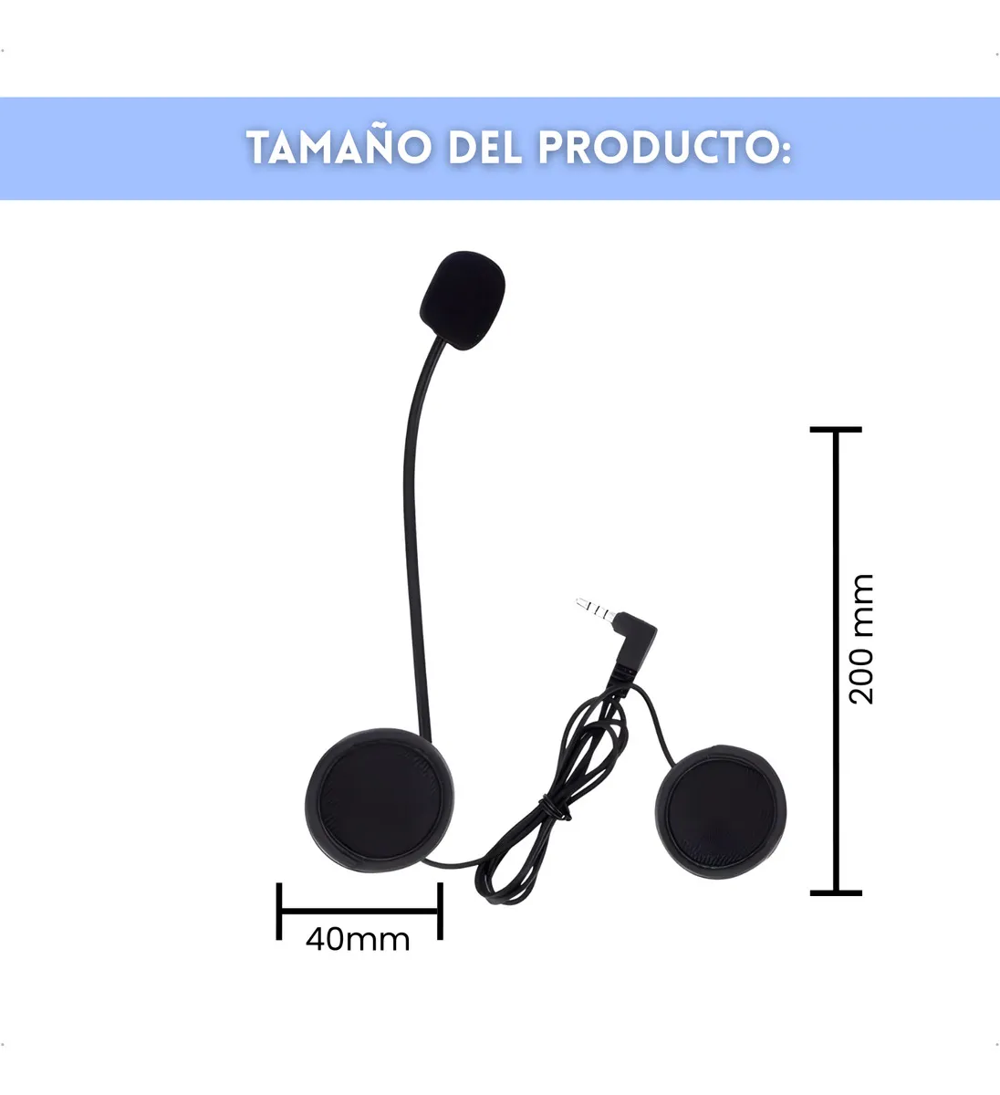 Ajuste: Ajuste por conexión directa al intercomunicador mediante plug 3.5 mm. Los parlantes se fijan al interior del casco mediante velcro o adhesivo.